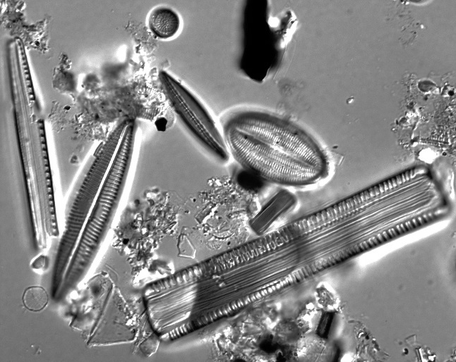 Les diatomées sont des algues microscopiques unicellulaires, qui ont la particularité de posséder un squelette siliceux résistant à la putréfaction et aux traitements chimiques. Leur taille varie de quelques µm à plus de 500 µm. Ce sont des marqueurs biologiques spécifiques d'un milieu aqueux. On les retrouve isolées ou en colonies aux formes variables :